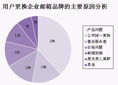 ? ? ? ?根據(jù)調(diào)查結(jié)果,約50%的受訪者,曾經(jīng)一次或多次更換企業(yè)郵箱品牌,原因與產(chǎn)品問題、售后服務(wù)問題、價(jià)格問題、郵箱到期等有關(guān)。