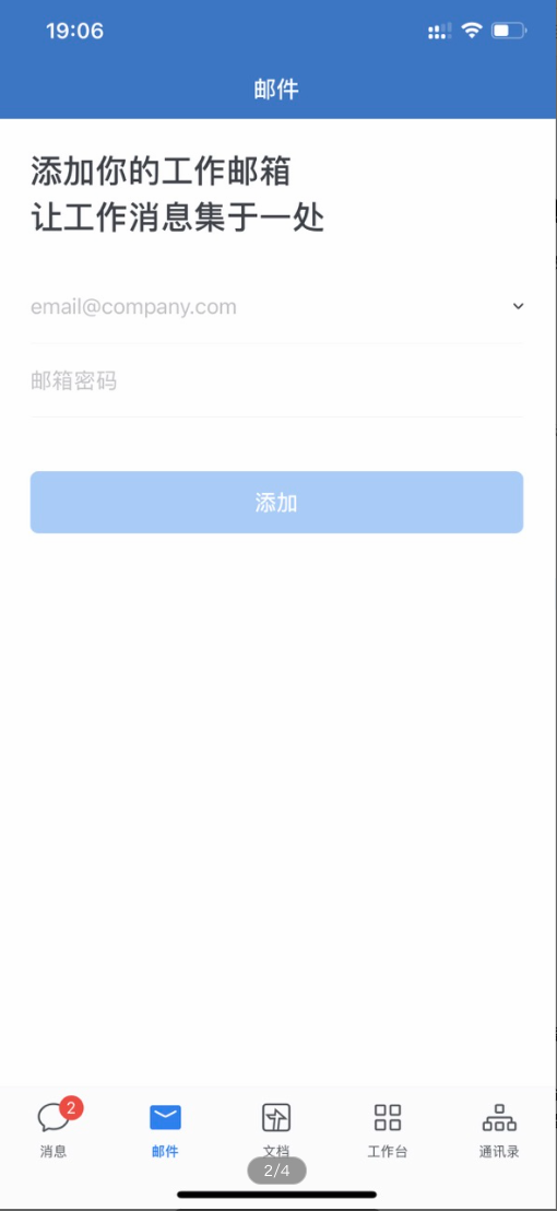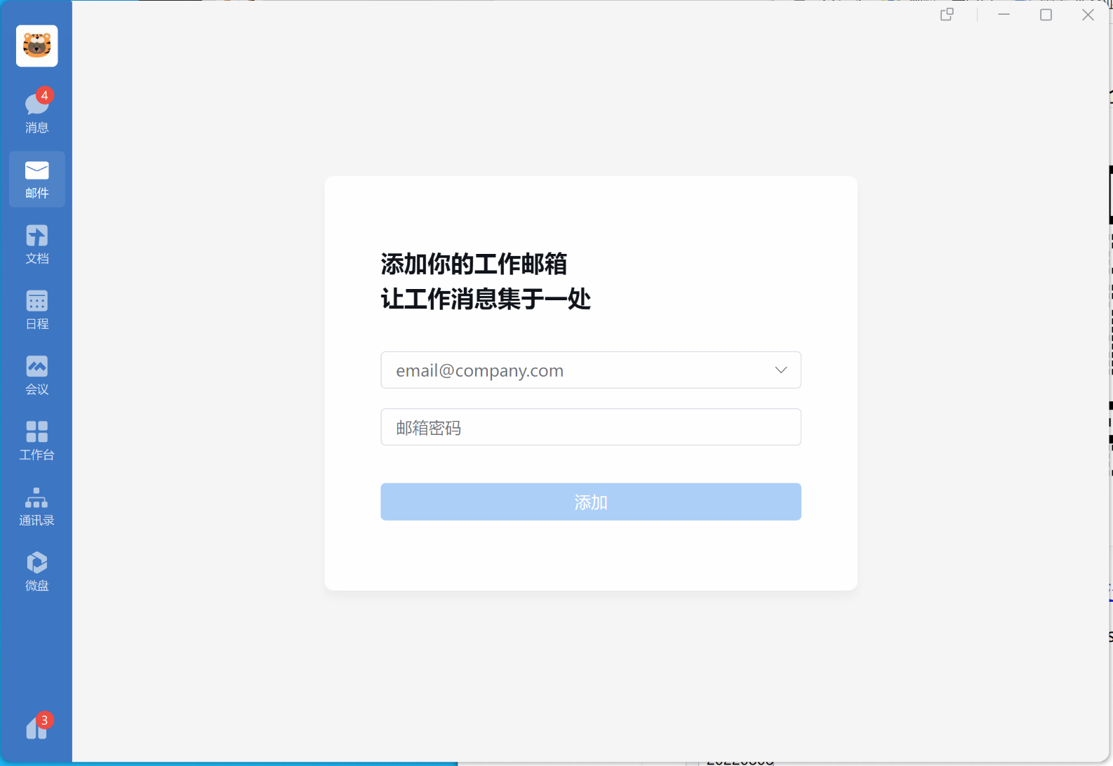 2.請(qǐng)注意,要實(shí)現(xiàn)員工在企業(yè)微信上登錄已有郵箱,只需要員工在自己的企業(yè)微信客戶端郵件按鈕進(jìn)行賬號(hào)密碼登錄。