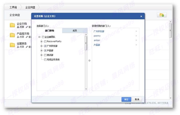 ?????企業(yè)網(wǎng)盤是用于企業(yè)內(nèi)部共享文件的網(wǎng)絡(luò)硬盤,成員上傳文件至企業(yè)網(wǎng)盤后,企業(yè)的其他員工即可看到該文件,例如上傳一些公司的集體活動照片,公司的制度文檔等需要共享的資源,成員登陸郵箱后可下載分享,也可以對企業(yè)成員設(shè)置權(quán)限分配。將根文件夾分配給不同的部門,或成員使用。